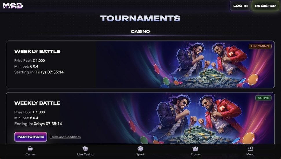 MadCasino continue sur sa lancée avec une série de bonus hebdomadaires disponibles du mercredi au dimanche. Le montant total des bonus disponibles chaque semaine peut atteindre 7 500€, une somme impressionnante.